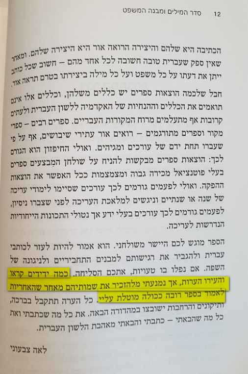 מתוך סדרת הספרים "עברית כהווייתה" של ד"ר לאה צבעוני עברתי מראש על שלושה מהם (בספר "סדר המילים ומבנה המשפט" לאה בחרה שלא לציין שמות אלא לכתוב תודה כללית).