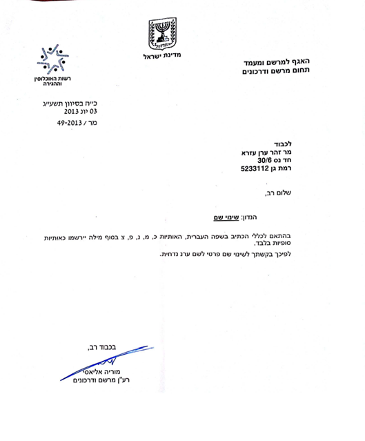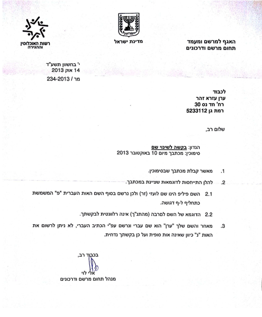 פניתי למשרד הפנים כדי לשנות את השם. ישבתי מול הפקידה והסברתי לה מה אני מבקש. לקח לה זמן להבין מה אני רוצה. כשהבינה היא אמרה שהיא לא יכולה לשנות כי "טעות לכתוב ככה".