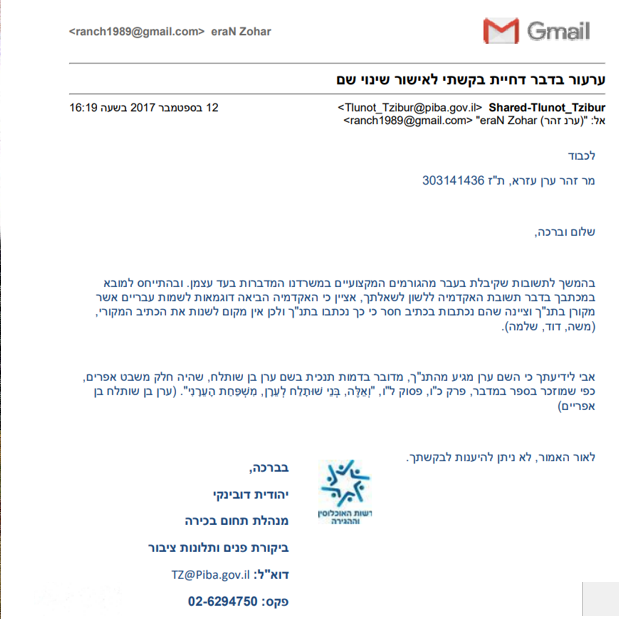 בכל הקשור לחוק – הם לא ממש סתרו את מה שאמרתי שאין בחוק משהו שיכול למנוע ממני את הכתיב ערנ. רק בתום הדיון השני, ובהנחיית השופט, התגבש הטיעון לפיו הסירוב לבקשתי נובע מהשפעות רוחביות.