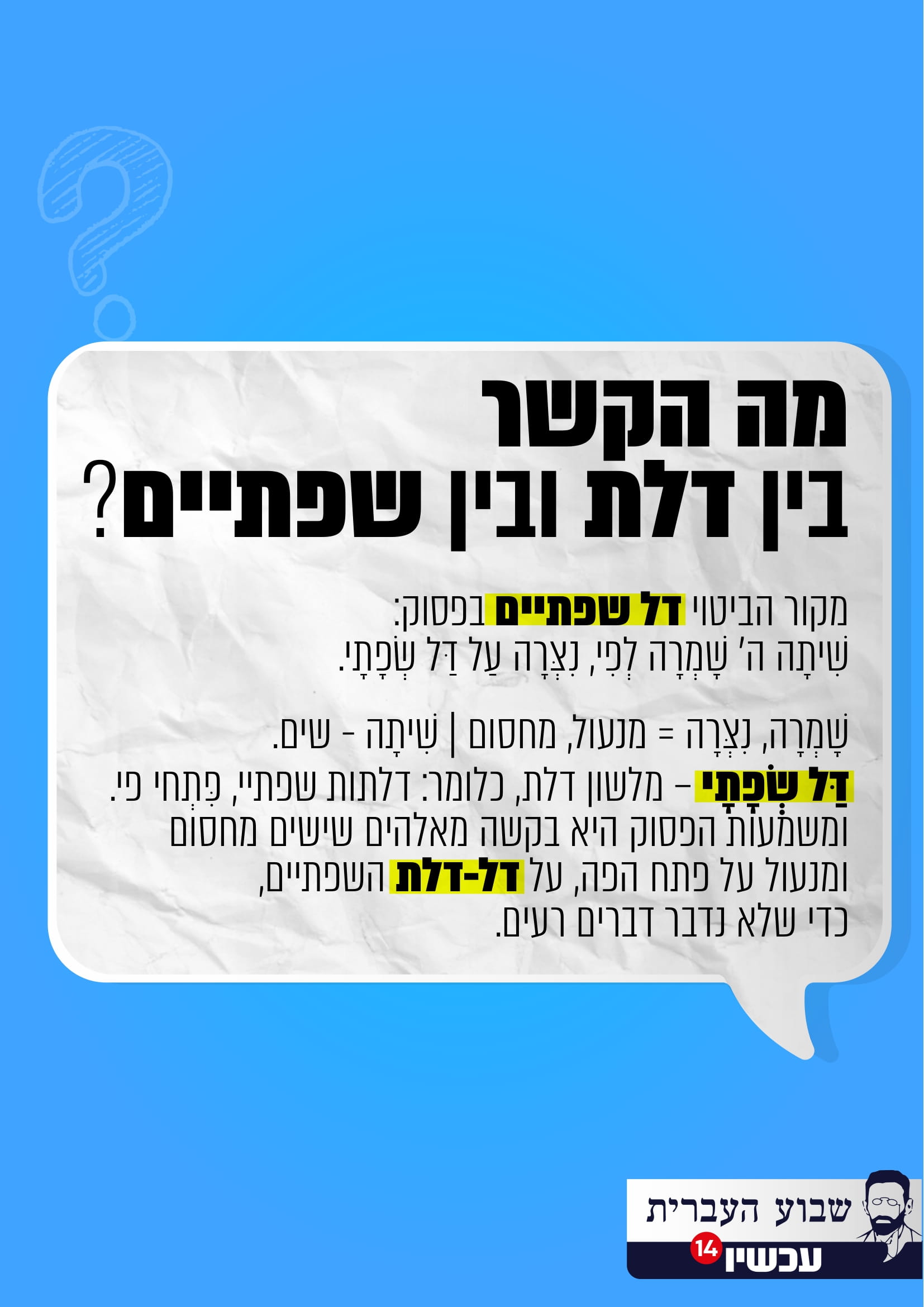 דַּל שְׂפָתָי – מלשון דלת, כלומר: דלתות שפתיי, פִּתְחֵי פי.