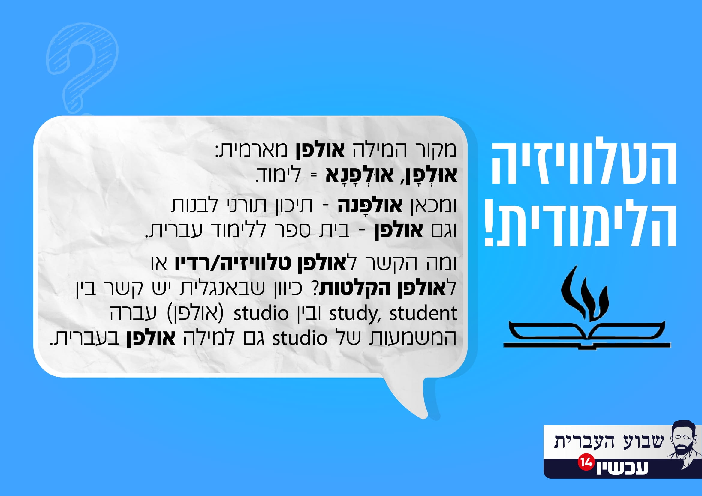 רִישַתִּי את מתחם ערוץ 14 בעשרות מודעות (36, אבל מי סופר) בעלות מסר לשוני חביב ומעניין הקשור למה שרואים במרחב המתחם: מה הקשר בין אולפן טלוויזיה לאולפן לימוד, איך הוגים תיון ודלפק, על הקשר בין עצמות למדרגות, בין חלון לחליל, בין ארון לתאנים ועוד הפתעות * מיוחד לשבוע העברית וליום העברית.