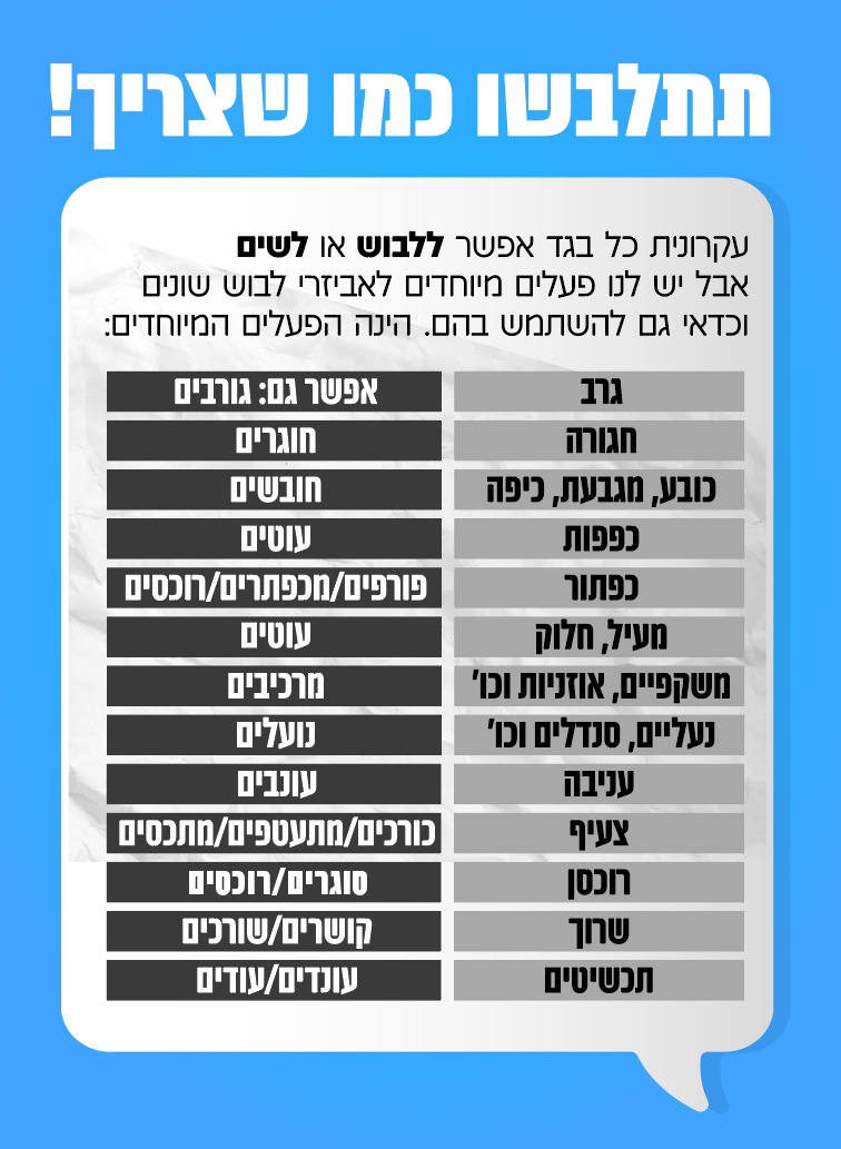 עקרונית כל בגד אפשר ללבוש או לשים, אבל יש לנו פעלים מיוחדים לאביזרי לבוש שונים, וכדאי גם להשתמש בהם.